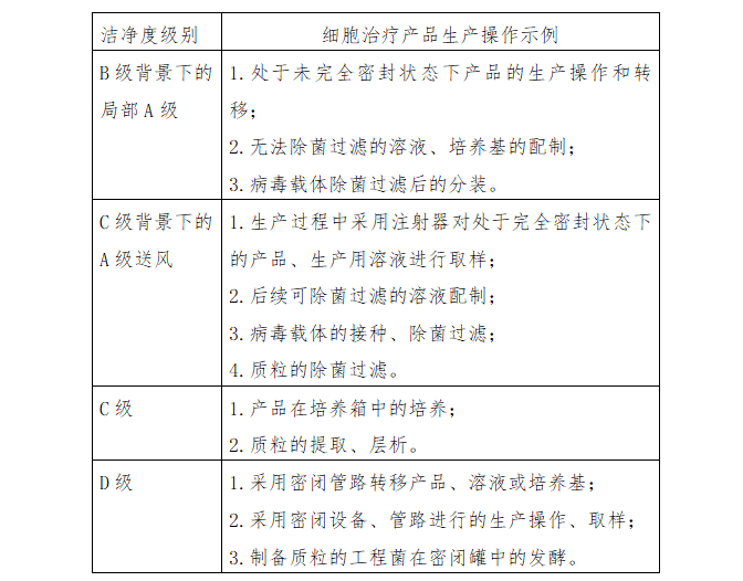 第十五條【生產(chǎn)操作環(huán)境的潔凈度級(jí)別】細(xì)胞治療產(chǎn)品、病毒載體、質(zhì)粒的生產(chǎn)操作環(huán)境的潔凈度級(jí)別,可參照表格中的示例進(jìn)行選擇。