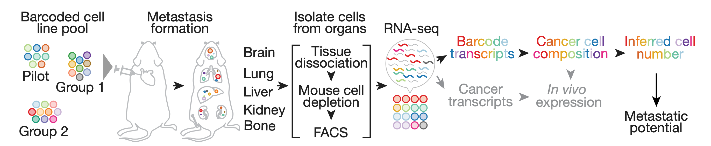 他們先給每一個癌細(xì)胞系做了DNA條形碼標(biāo)記,然后將所有需要研究的癌細(xì)胞系混合在一起,注射到免疫缺陷小鼠體內(nèi)。五周之后,再采集小鼠不同組織或器官的樣本,完成高通量測序,看看不同的組織或器官中各種DNA條碼的量。