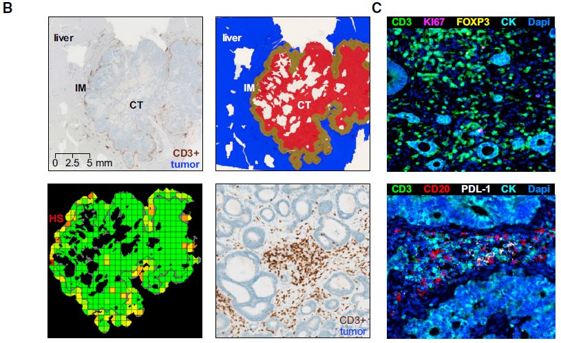 免疫評分(ImmunoScore, IS):是一種將腫瘤微環(huán)境中的T細(xì)胞和細(xì)胞毒性T細(xì)胞的密度進(jìn)行量化的標(biāo)準(zhǔn)檢測方法,對腫瘤的轉(zhuǎn)移及預(yù)后判斷具有重要的價(jià)值,目前已被證明可預(yù)測早期和晚期結(jié)直腸癌患者的臨床結(jié)果。