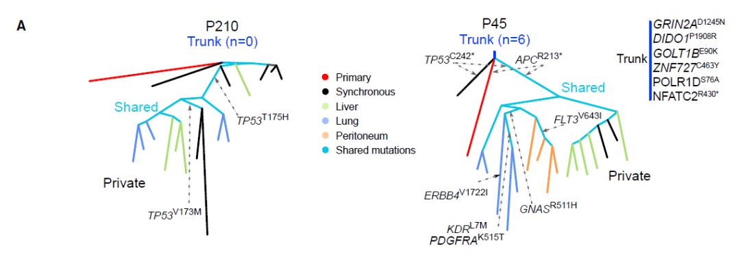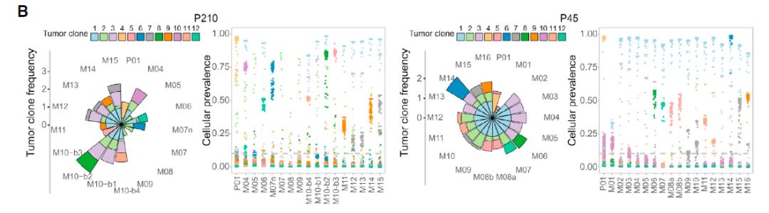 對于這兩位患者而言,在隨訪時(shí)間線上某一點(diǎn)發(fā)展的12種不同的腫瘤克隆超過克隆檢測閾值10%,具有相似克隆突變的轉(zhuǎn)移灶在解剖學(xué)上,時(shí)間上和系統(tǒng)發(fā)育上密切相關(guān)。