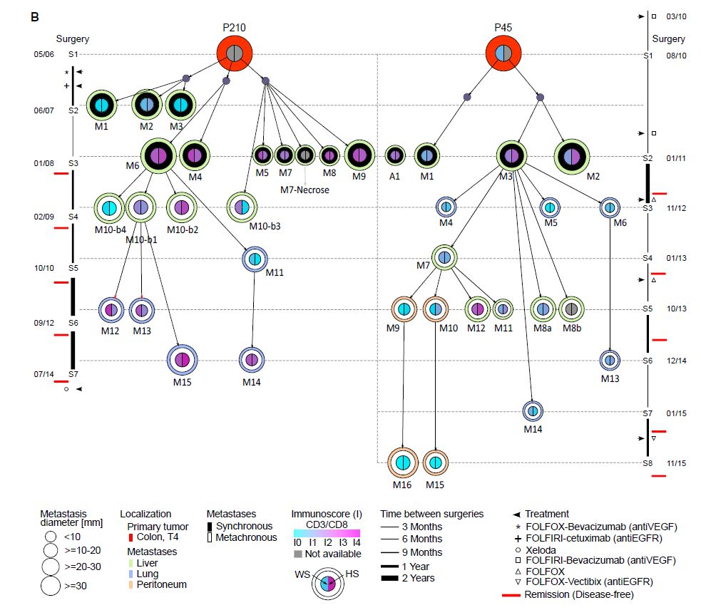 實(shí)驗(yàn)選取2例IV期CRC患者的31例轉(zhuǎn)移灶作為縱向數(shù)據(jù)集,這2名患者存活時(shí)間極長。在疾病進(jìn)展中,對2名患者P210和P45的轉(zhuǎn)移灶內(nèi)與灶間不同的時(shí)間部位進(jìn)行取樣(包括完全切除的原發(fā)腫瘤,同步及異時(shí)轉(zhuǎn)移灶),共36個(gè)樣本,并通過全外顯子組測序、免疫組化(IHC)淋巴譜系標(biāo)記物定量來進(jìn)行基因組和腫瘤微環(huán)境表征,用以評估轉(zhuǎn)移內(nèi)、轉(zhuǎn)移間和患者間的基因組和免疫異質(zhì)性。