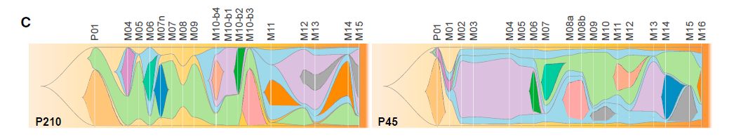 盡管有線性進(jìn)化模型的跡象,但存在平行進(jìn)化的要素,例如原發(fā)和轉(zhuǎn)移性腫瘤之間的高水平遺傳分化。此外,在轉(zhuǎn)移M6中觀察到TP53的平行進(jìn)化,其中在兩個(gè)不同的克隆中檢測到兩個(gè)突變的基因座(患者P210的持續(xù)型克隆1和消除型克隆12)。同時(shí),實(shí)驗(yàn)觀察到在幾個(gè)轉(zhuǎn)移瘤中,獨(dú)特的腫瘤克隆正在進(jìn)行進(jìn)化。 此外,患者P210在空間異質(zhì)性M10樣品中存在不同的腫瘤克隆現(xiàn)象,這也證明了轉(zhuǎn)移灶內(nèi)克隆的異質(zhì)性。