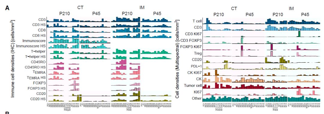 為了闡明免疫背景,實(shí)驗(yàn)通過單重IHC,多光譜成像和多重免疫基因表達(dá)來檢測腫瘤浸潤淋巴細(xì)胞??傮w而言,P210和P45轉(zhuǎn)移灶的表型差異較大。