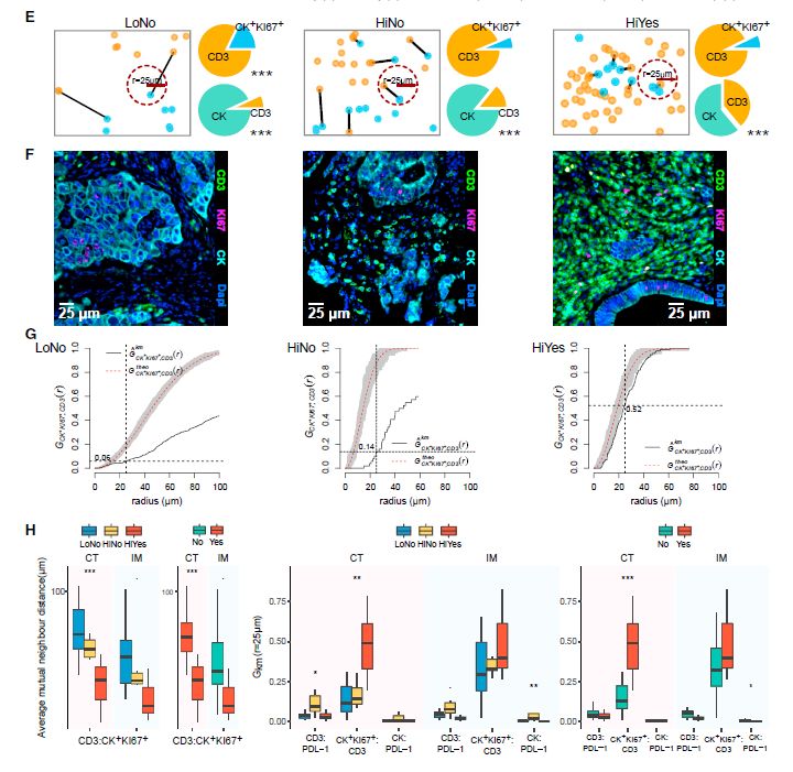 因此,免疫編輯的轉(zhuǎn)移灶具有高免疫評分和T細(xì)胞與增殖的腫瘤細(xì)胞之間短距的特點(diǎn),而非免疫編輯轉(zhuǎn)移灶的FOXP3+T細(xì)胞密度增加,PD-L1表達(dá)增加,以及T細(xì)胞與PD-L1+細(xì)胞顯著接近。