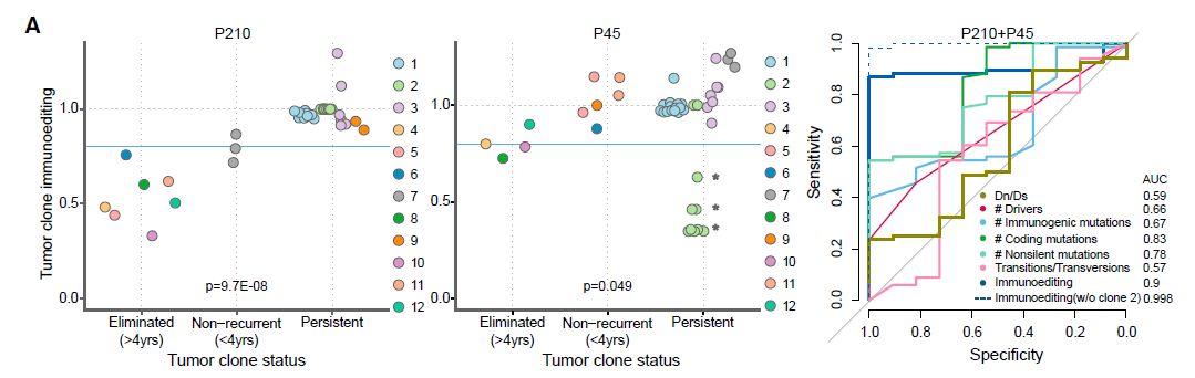 實(shí)驗(yàn)結(jié)果顯示,使用免疫選擇來區(qū)分持續(xù)型和消除型克隆優(yōu)于Dn/Ds評分;來自相同轉(zhuǎn)移的不同克隆具有不同的免疫編輯評分,免疫編輯是腫瘤克隆復(fù)發(fā)較為理想的預(yù)測因子(AUC = 0.89),并且若除去P45克隆2的影響因素,則更佳(AUC = 0.98)。在具有異時(shí)轉(zhuǎn)移的卵巢癌病例中觀察到類似的結(jié)果。