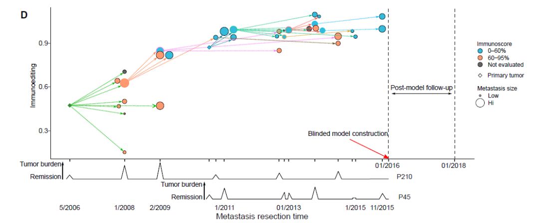 通過將免疫編輯和免疫指數(shù)疊加在轉(zhuǎn)移灶傳播樹形圖上來評估免疫系統(tǒng)與腫瘤隨時(shí)間傳播之間的關(guān)系。這說明了轉(zhuǎn)移灶的局部控制(較小的尺寸)和免疫指數(shù)在預(yù)防復(fù)發(fā)中起到保護(hù)作用。因此,轉(zhuǎn)移進(jìn)展和復(fù)發(fā)時(shí)間取決于機(jī)制相關(guān)的免疫參數(shù)。