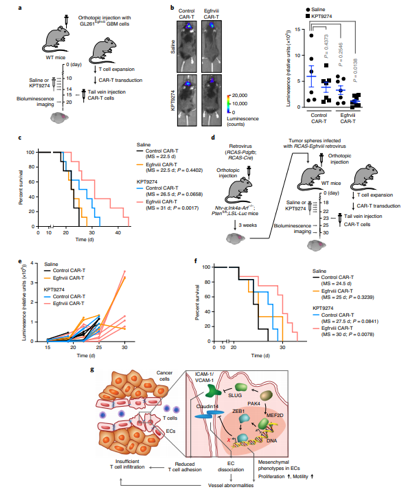 在這項(xiàng)研究中,研究人員通過對(duì)膠質(zhì)母細(xì)胞瘤小鼠模型進(jìn)行分析發(fā)現(xiàn),抑制PAK4或能降低血管的異常,從而改善T細(xì)胞的浸潤(rùn)并抑制小鼠腫瘤的生長(zhǎng),大約80%PAK4被敲除的小鼠存活了至少60天,而所有野生型小鼠在腫瘤植入后的40天內(nèi)發(fā)生了死亡。另外,利用EGFRvIII導(dǎo)向的CAR-T細(xì)胞療法和PAK4抑制劑進(jìn)行的研究中,研究者發(fā)現(xiàn),相比輸注5天后僅接受CAR-T細(xì)胞治療的小鼠相比,聯(lián)合治療的小鼠機(jī)體中腫瘤的生長(zhǎng)減少了近80%,而值得注意的是,即使其它組的小鼠在腫瘤植入后33天內(nèi)發(fā)生了死亡,聯(lián)合治療組中仍然有40%的小鼠存活了下來。