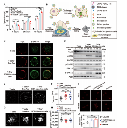 研究團(tuán)隊(duì)建立了新型的T細(xì)胞表面錨定技術(shù),通過模擬跨膜蛋白的特性,利用疏水作用力先將脂質(zhì)錨定在T細(xì)胞膜上,再將脂質(zhì)與藥物脂質(zhì)體通過點(diǎn)擊反應(yīng)偶聯(lián)在T細(xì)胞膜上。