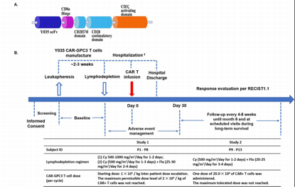 在這項(xiàng)研究中,研究人員對(duì)患有晚期GPC3+HCC(Child-Pugh A)的成年患者在環(huán)磷酰胺(cyclophosphamide)和氟達(dá)拉濱(fludarabine)誘導(dǎo)的淋巴細(xì)胞清除后,接受自體CAR-GPC3 T細(xì)胞治療,并評(píng)估這種療法的有效性和安全性。