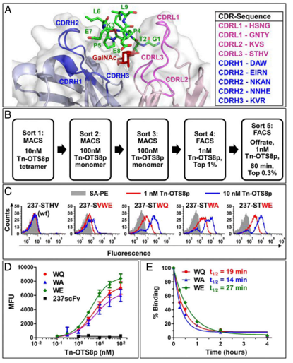 結(jié)果顯示,Tn-聚糖側(cè)翼的殘基(Tn-OTS8)為相互作用提供了顯著的結(jié)合能。用非同源人類抗原Tn-MUC1進(jìn)行選擇,可產(chǎn)生與多種Tn-糖蛋白廣泛反應(yīng)的scFv變異體。當(dāng)配置為CAR時(shí),表達(dá)這些scFv變體的工程T細(xì)胞表現(xiàn)出對(duì)O型糖基化缺陷的小鼠和人類癌細(xì)胞系改善的活性。T細(xì)胞現(xiàn)在可以識(shí)別帶有短糖的幾種不同蛋白質(zhì),與這些異常的糖鏈結(jié)合的藥物可以優(yōu)先識(shí)別癌細(xì)胞。