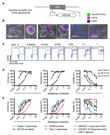 CD19 CAR-T細(xì)胞療法已被美國(guó)食品藥品管理局(FDA)批準(zhǔn)用于治療某些類型的血液癌癥,即B細(xì)胞淋巴瘤和急性淋巴細(xì)胞白血病。來自美國(guó)希望之城的研究人員將2種強(qiáng)效的免疫療法---溶瘤病毒(oncolytic virus)和嵌合抗原受體(CAR)T細(xì)胞(CAR-T)療法結(jié)合起來,成功地靶向和根除單獨(dú)用CAR-T細(xì)胞療法很難治療的實(shí)體瘤