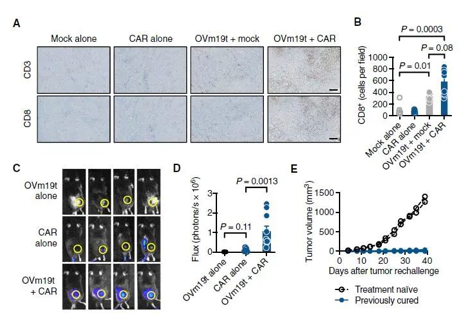 研究分析表明,CD19-CAR T細(xì)胞介導(dǎo)的腫瘤殺傷還誘導(dǎo)了垂死的腫瘤細(xì)胞釋放病毒,從而傳播了CD19t的腫瘤表達(dá)。而且,用溶瘤病毒和CAR T細(xì)胞組合治愈的癌癥小鼠表現(xiàn)出保護(hù)性抗腫瘤免疫力的延長(zhǎng)。這說明,免疫系統(tǒng)建立了對(duì)腫瘤的記憶反應(yīng)。
