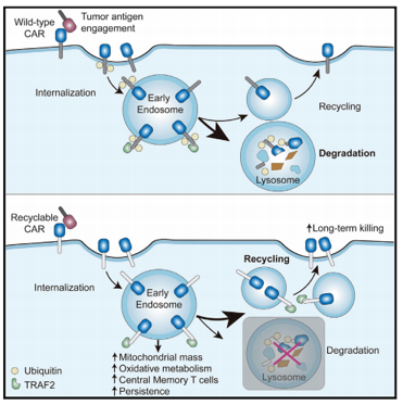 機(jī)制性探索發(fā)現(xiàn),改造后的CAR在T細(xì)胞中循環(huán)(recycling),并在激活后富集在胞內(nèi)內(nèi)體(endosome)中,其胞內(nèi)段4-1BB結(jié)構(gòu)域仍然結(jié)合著信號(hào)傳遞分子TRAF2,在胞內(nèi)執(zhí)行信號(hào)傳遞功能,因而增強(qiáng)了4-1BB下游信號(hào),促進(jìn)了T細(xì)胞的代謝重編程(提高線粒體的生成及氧化磷酸化代謝)及中央型記憶T細(xì)胞的分化。研究團(tuán)隊(duì)將這種全新的設(shè)計(jì)命名為可循環(huán)CAR(Recyclable CAR)。這些結(jié)果為后續(xù)可循環(huán)CAR的臨床驗(yàn)證提供了堅(jiān)實(shí)的基礎(chǔ)。